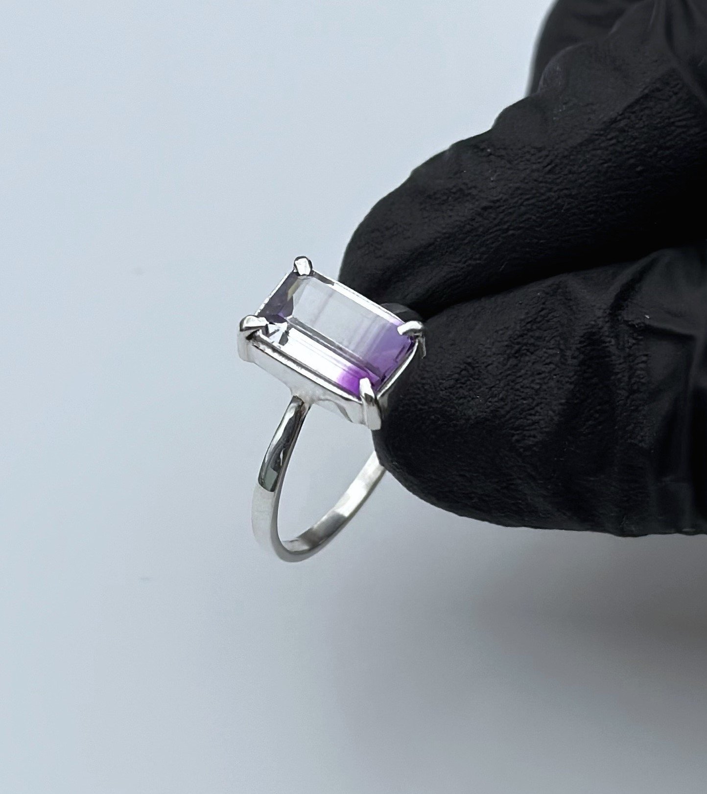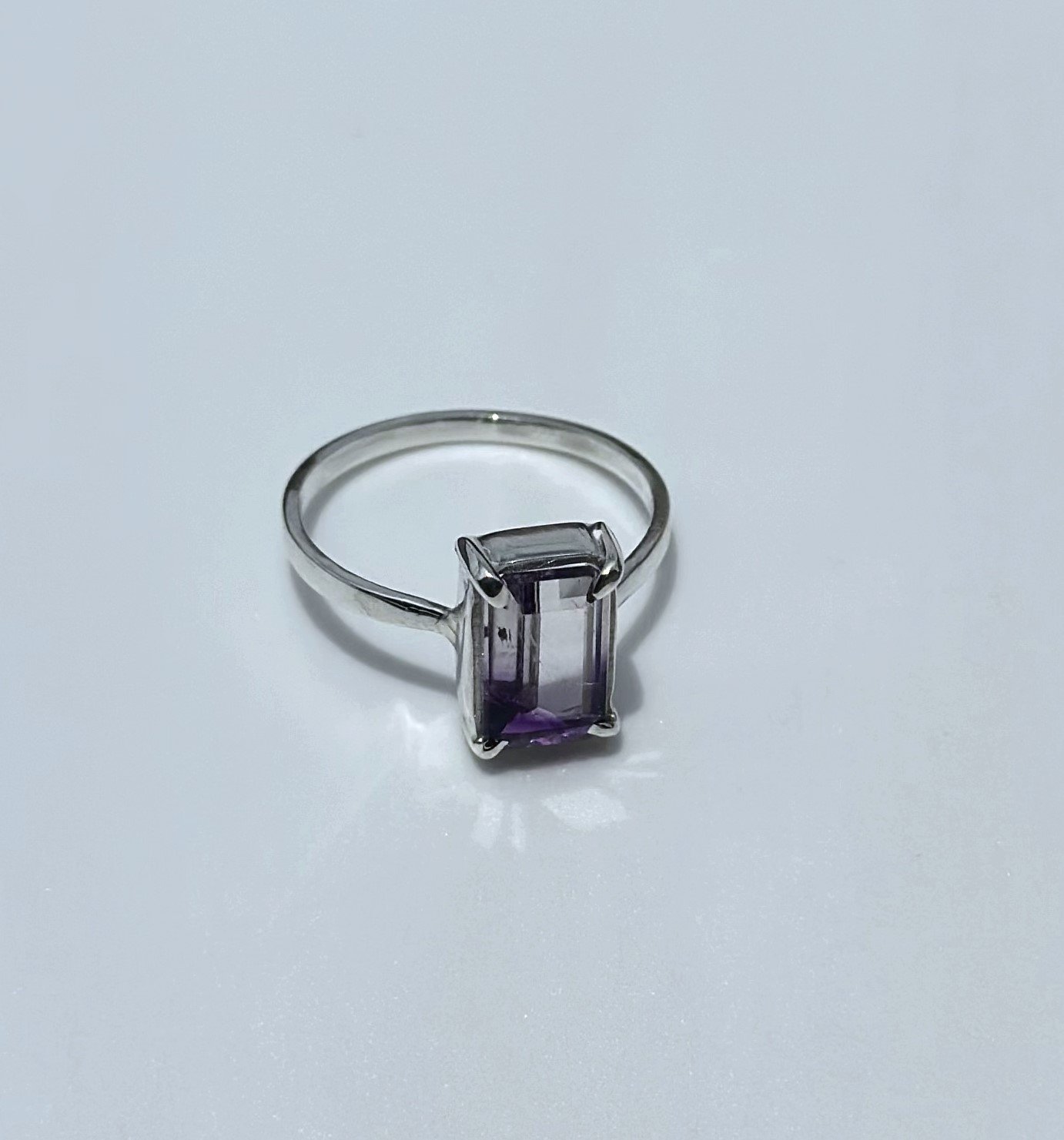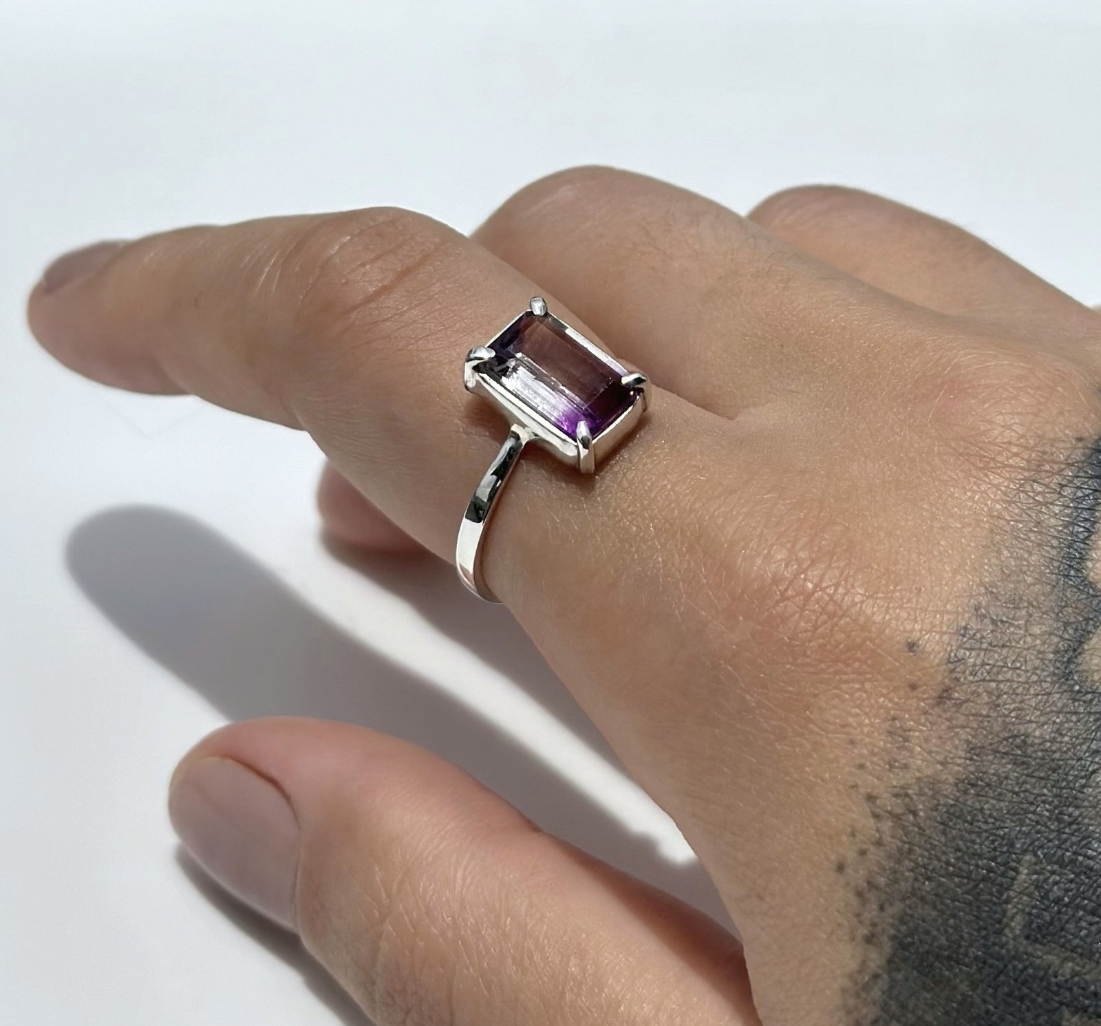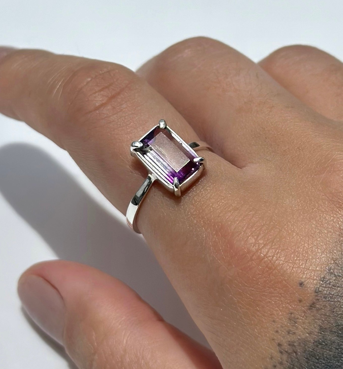 O anel com a pedra natural de ametista bicolor é uma peça delicada. Com um design leve, ele se destaca pela sutileza e pelo brilho.